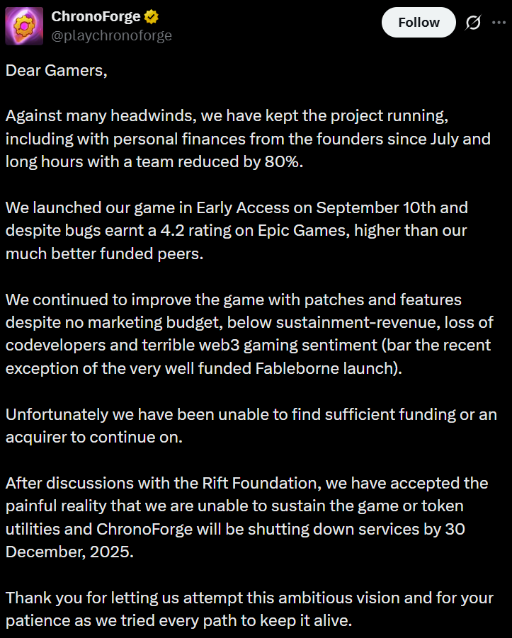 Theo thông báo chính thức từ đội ngũ phát triển, ChronoForge buộc phải ngừng hoạt động do thiếu hụt nguồn vốn, khó khăn trong việc thu hút người chơi thực sự, và sự suy giảm niềm tin chung vào các dự án Web3 trong thời gian gần đây.